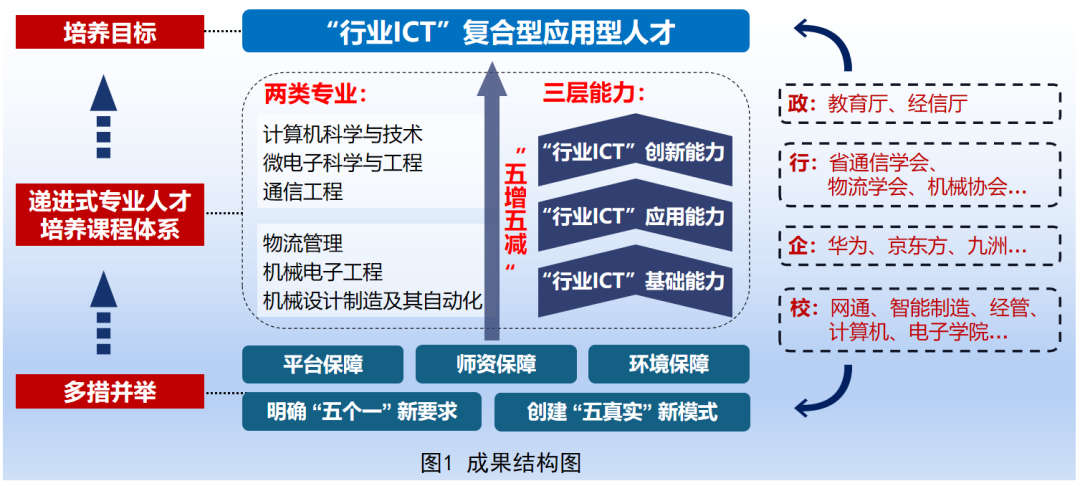 (1)政行企校协同推进“行业ICT”人才培养,提出将ICT与行业相融合的复合型应用型人才培养理念,使学科专业与ICT产业变化发展紧密结合。