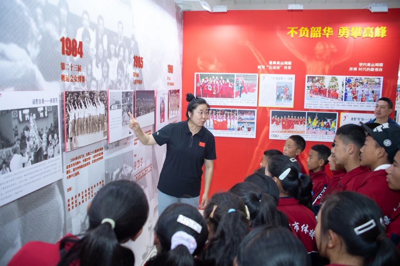 “十四五”期间,天津体育学院主办的“国家荣誉——中国女排精神展”累计观展超100万人次,天津体育学院奥运冠军教师为参展观众讲解女排精神展。(图片来源:天津体育学院)