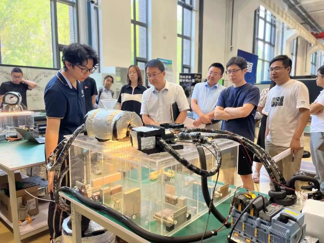 评委老师们对各组作品依次参观,并就实物作品中的细节与同学们进行沟通与提问,结合各用电设备运行情况以及各温度测点数据变化对实物作品的功能和性能进行评判,并提出进一步完善的建议。