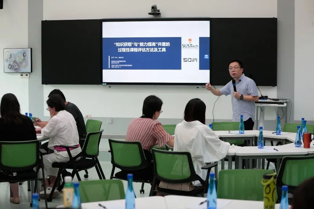 工作坊二由南方科技大学系统设计与智能制造学院工业设计专业团队熊异主持,主题为《“知识获取”与“能力提高”并重的过程性课程评估方法及工具》。熊老师从课程评估方法改革的背景讲起,层层深入的阐释了新工科项目制课程评估体系改革的必要性,重点介绍了南方科技大学系统设计与智能制造学院课程考核评估改革核心思想与具体措施,并通过教学案例的展示充分解读评估体系的框架与实施思路。与会老师针对多元化评估工具的使用、评估观测点的设计、评估改革遇到的阻力与困难等方面开展了热烈讨论。