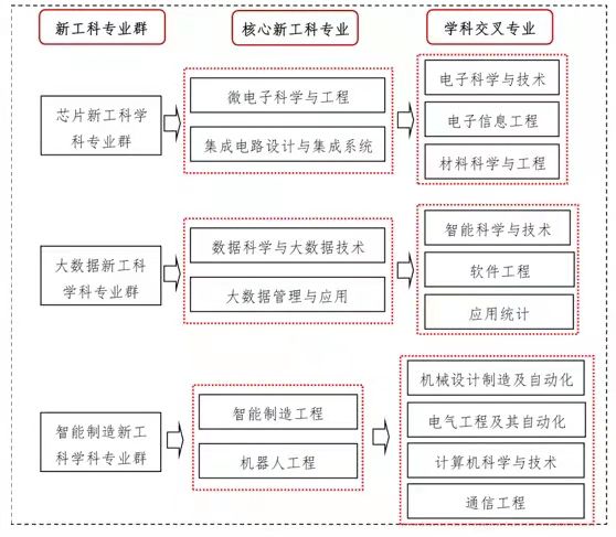 湖北工业大学对接产业群、产业链,依托学院核心新工科专业,构建芯片、智能制造、大数据3个多学科交叉专业集群(图3),并在修订2020级人才培养方案时,根据专业群整合优化课程资源。