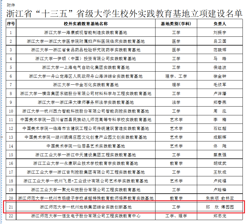 2017年以来,围绕轨道交通和智能制造领域,浙江师范大学牵头成立了浙江省轨道交通产教融合联盟,牵头组建了浙江省工程教育国际化联盟,共同发起成立了智能制造工程专业联盟,先后获批国家发改委“轨道交通、智能制造及现代物流产教融合实训基地”、教育部“智能制造领域中外人文交流人才培养基地项目”、浙江省“2011协同创新中心——城市轨道交通运营安全技术及装备研发中心”、浙江省“重点实验室——城市轨道交通智能运维技术与装备重点实验室”、浙江省“重点建设实验教学示范中心——智能制造工程实验教学中心”、浙江省“大学生校外实践教育基地——浙江师范大学与杭州地铁大学生综合实践创新基地”等一大批以大学生创新精神和实践能力培养为核心的新工科实践育人基地,通过整合高等院校、科研机构、行业企业等各方力量,正向着轨道交通和智能制造行业人才培养培训高地、科技成果研发与转化基地和学科创发展引领阵地而前进。