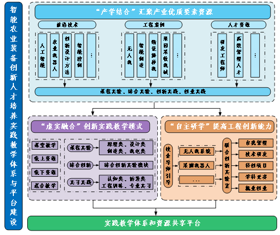 主动对接国家智能农业装备产业发展需求,汇聚产业优质要素资源,实现产业与教学的有效结合;构建虚实融合环境,为课程实验、综合创新实验、实习实践提供技术支持;建立以学生为主体的联合创新实验室,有效提升学生自主研学的能力;实施资源共享,为不同类型学生工程创新能力培养提供实践平台。