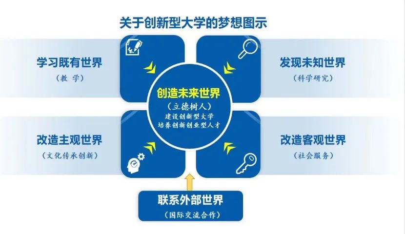 从认识世界改造世界的角度来说,创新型大学应以创造未来世界为核心,坚守立德树人的初心,系统集成学习既有世界、发现未知世界、改造主客观世界,联系外部世界,能够通过系统自组织产生“涌现”效应。