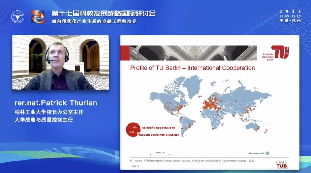 柏林工业大学校长办公室主任、大学战略与质量控制主任Patrick Thurian教授带来了题为《engineering education in Germany-Challenges digitalization and sustainability》的报告,重点介绍了柏林工业大学的工程教育和博洛尼亚进程、工程教育的挑战和质量管理。柏林工业大学的课程设计综合了数字化和可持续性,并呈现出T型教育。为了应对工程教育挑战,柏林工业大学发展出以课题为基础的学习和教学、以研究为基础的学习和劳动力市场资格证书、国际化的职业准备等。为了保证柏林工业大学工程教育的质量,其建立了质量管理系统,该系统自下而上分别由教授评估、教职工评估、大学评估/教职工和大学评估组成。