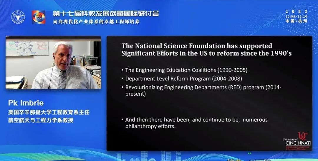 美国辛辛那提工程教育系主任、航天航空与工程力学系Pk Imbrie教授作了题为“Curriculum Reform and Curriculum System Reform Strategies in Engineering Education”的报告。他提出工程教育的五大转变。一是从注重实践转向注重工程科学和理论分析;二是转向基于成果的教育和认证;三是强调工程设计;四是转向应用教育、学习和社会行为科学研究;五是转向在教育中整合信息、计算和通信技术。